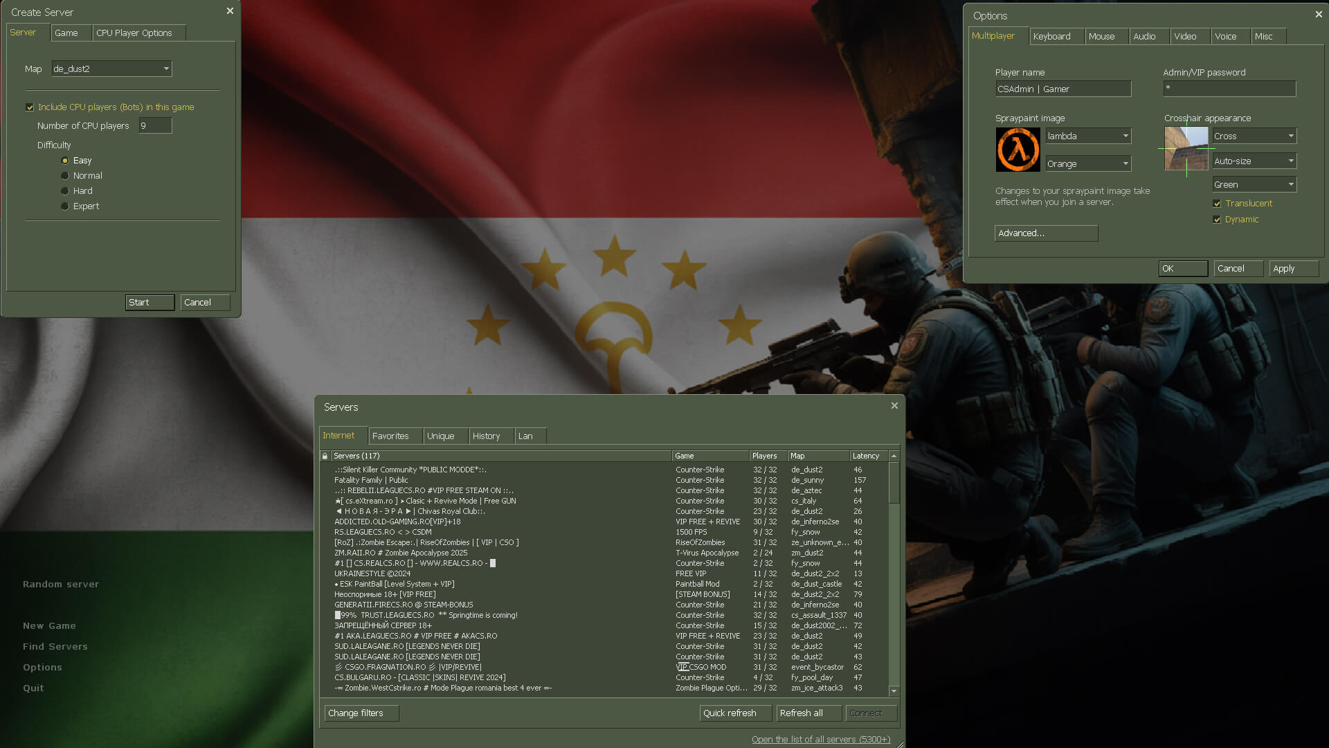 Контр Страйк 1.6 Таджикистан выделяется уникальным оформлением интерфейса, вдохновлённым национальным флагом Таджикистана – красным, белым и зелёным с золотой короной и звёздами в центре. Эти цвета символизируют мужество, чистоту и процветание народа, а также его стремление к гармонии и независимости. Для патриотов Таджикистана такой дизайн – это не просто эстетика, а способ выразить гордость за свою страну. Золотая корона в меню игры напоминает о богатой истории и культурных ценностях, а яркий фон создаёт вдохновляющую атмосферу.